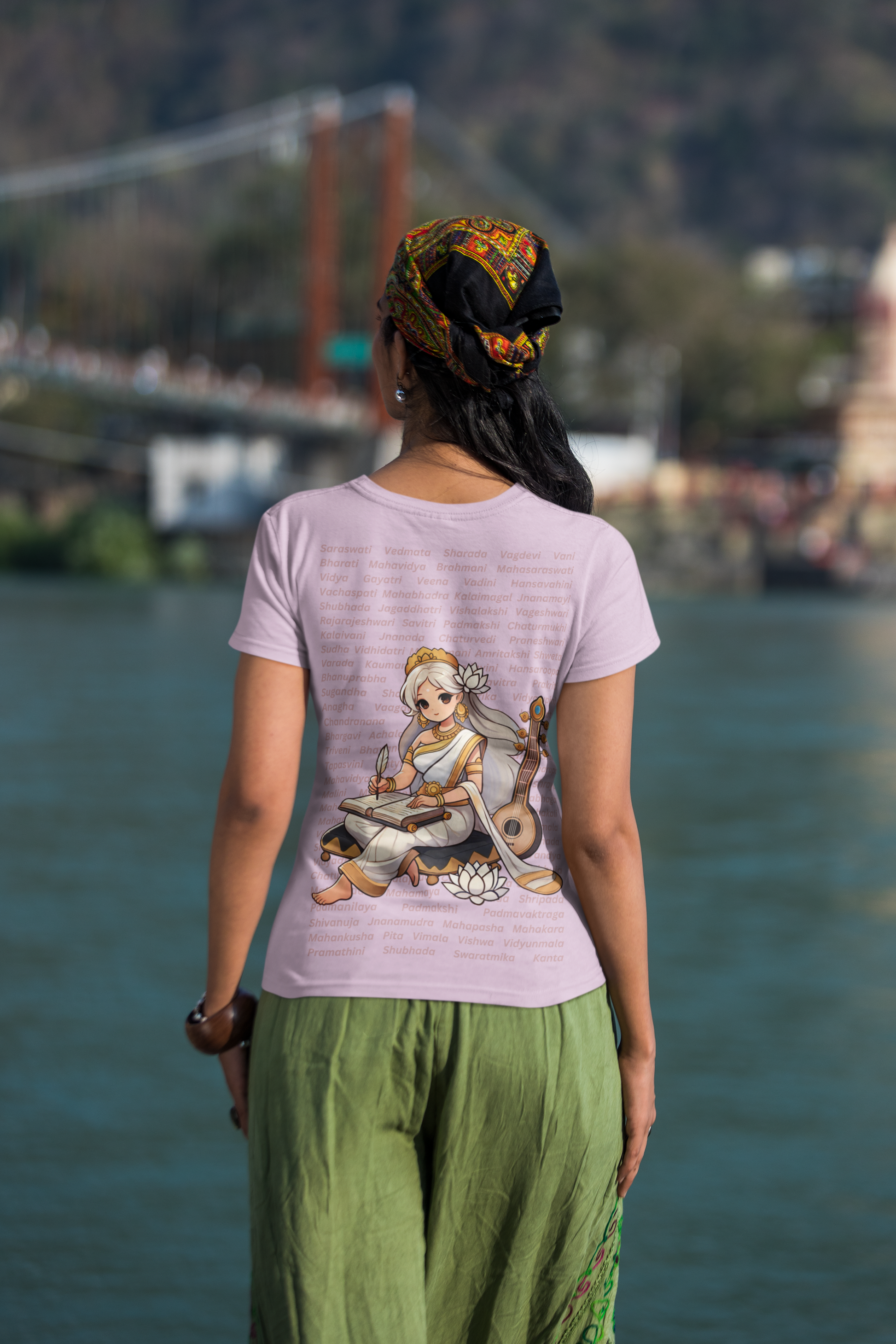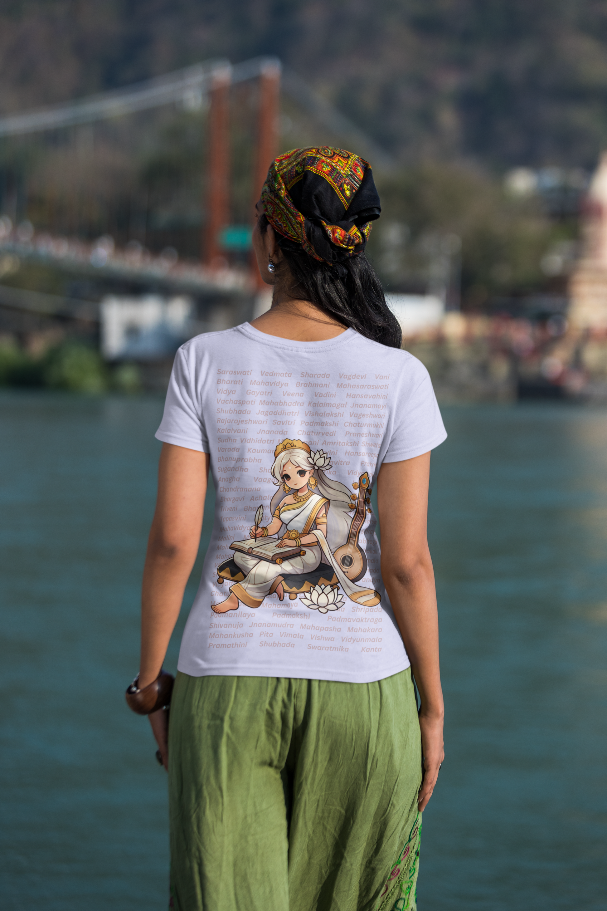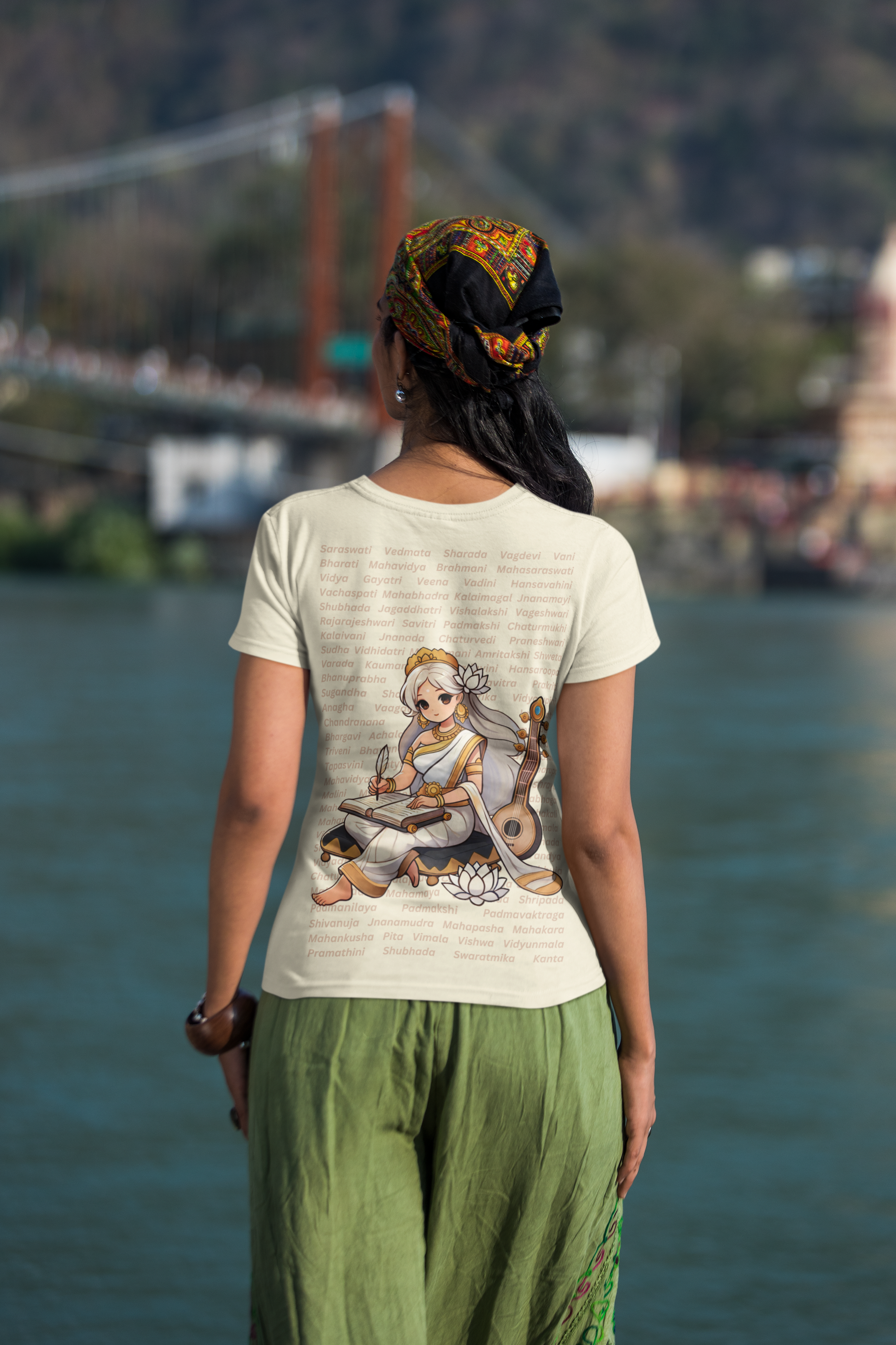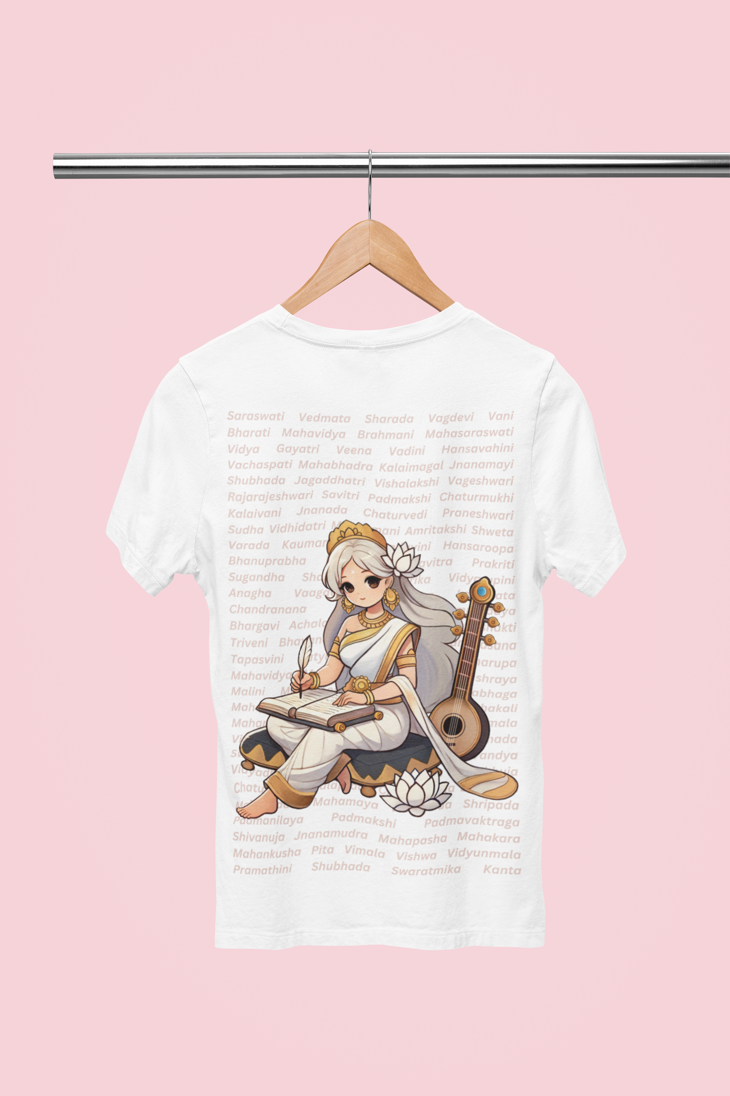 Behind her, 108 names of Saraswati echo like a mantra, reminding us that learning is not just power - it’s liberation.