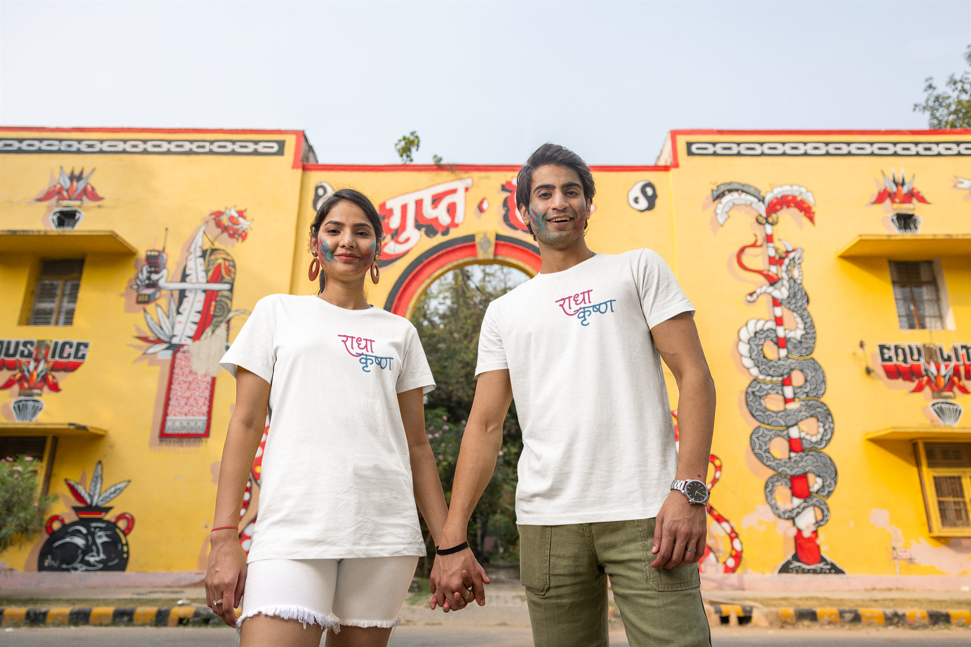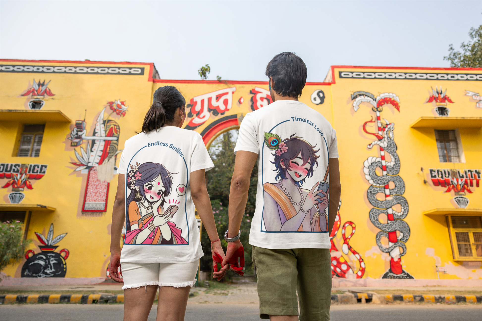 Inspired by the eternal bond of Krishna and Radha, this matching couple t-shirt set blends mythology with modern-day love. The playful innocence in Krishna’s blush and Radha’s joy reflects a bond that’s pure, timeless, and full of sweet everyday moments.